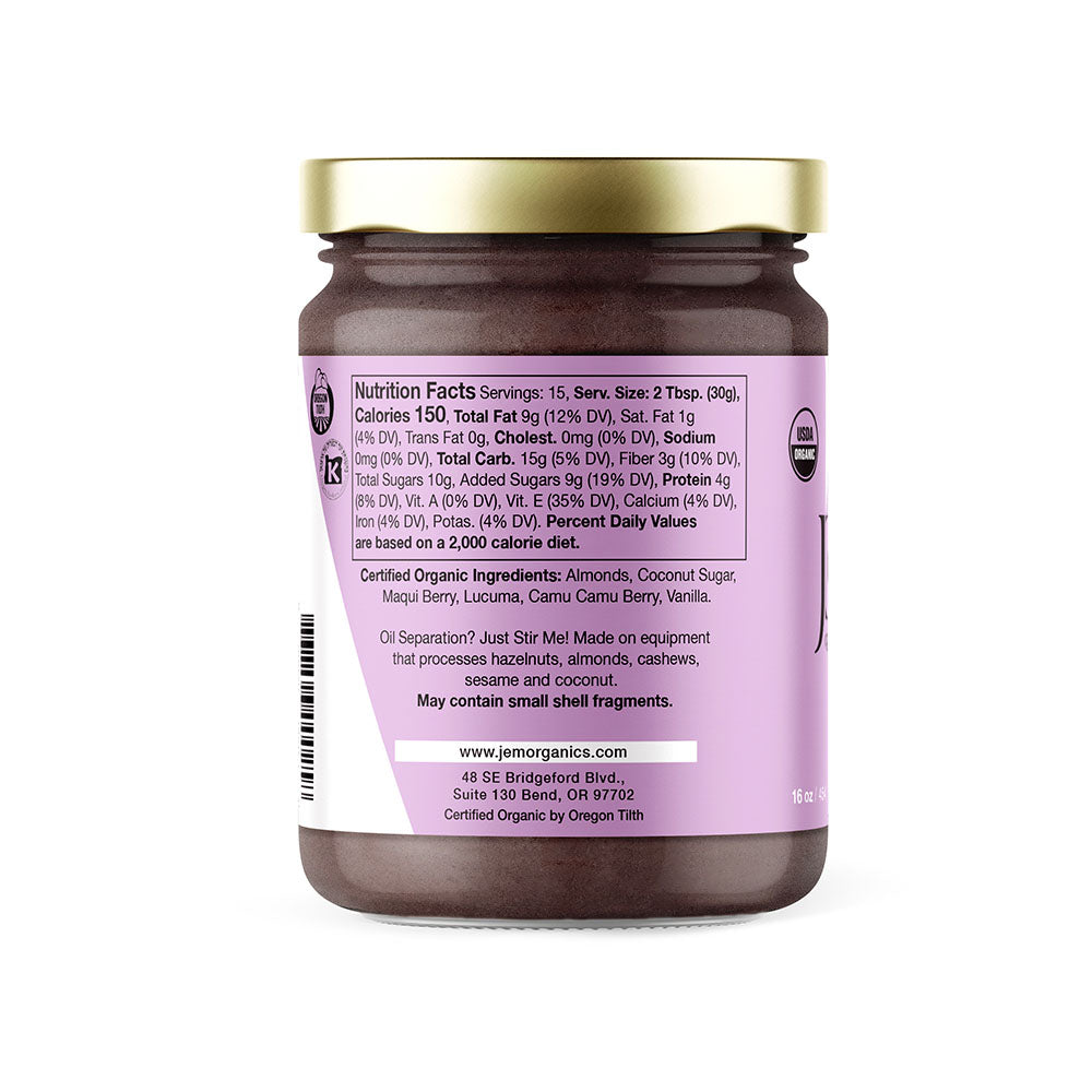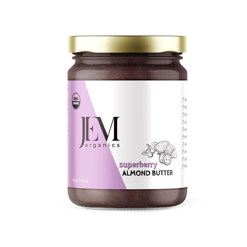 Discover the vibrant and antioxidant-rich world of JEM Organics' Superberry Nut Butter, where the lusciousness of mixed berries meets the creamy decadence of our signature nut blend. Every jar is packed with a superfood punch, combining nutrient-dense berries and smooth, flavorful nut butter for a delightful taste experience. Perfect as a fruity spread, a topping for your breakfast bowl, or a sweet treat straight from the jar. JEM Organics ensures a guilt-free indulgence, delivering a burst of flavor and a boost of energy in every spoonful. Elevate your snack time with the irresistible charm of Superberry.